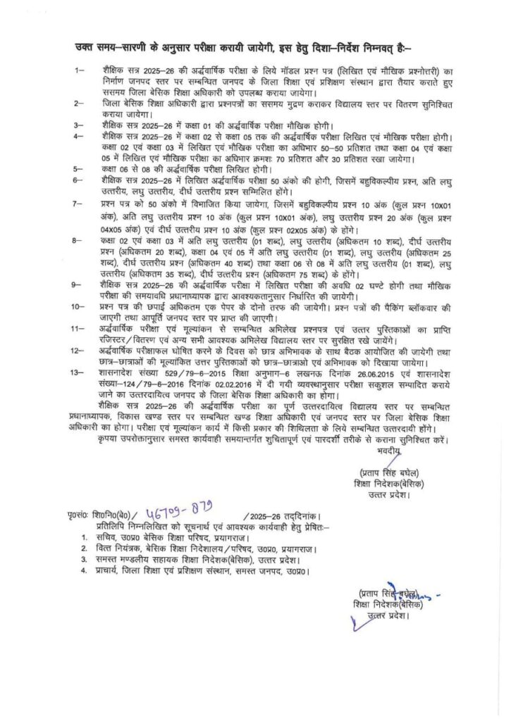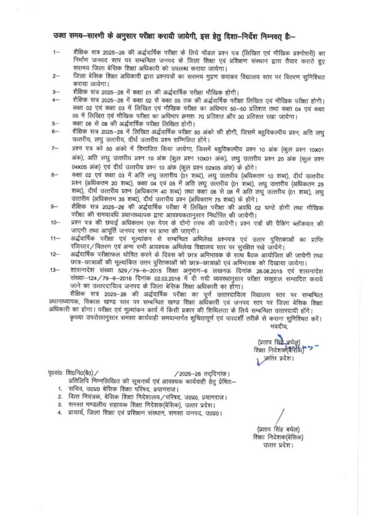 Time Table Half Yearly : शैक्षिक सत्र 2025-26 की अर्धवार्षिक परीक्षा हेतु निर्देश और समय-सारणी